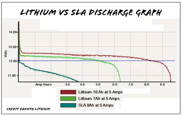 - La nombro unu kialo por ne uzi plumban acidan baterion estas pezo. Pakoj de litio kaj litio-fosfato estas frakcio de la pezo dum ili ofertas pli grandan ĉelan densecon. Ĉi tio tradukas al pli granda funkcia tempo, aŭ kapablo funkciigi nian ilaron por multe pli longe sur la kampo, sen pliigo de grandeco / pezo.